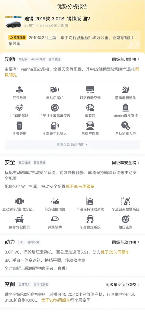 我们都知道,买车不仅要看购车成本,还要考虑用车成本,这辆途锐 2019款 3.0TSI 锐锋版 国V的10年平均用车成本约22473元/年,同级车最低是16093元/年,最高是31320元/年,它的用车成本适中。