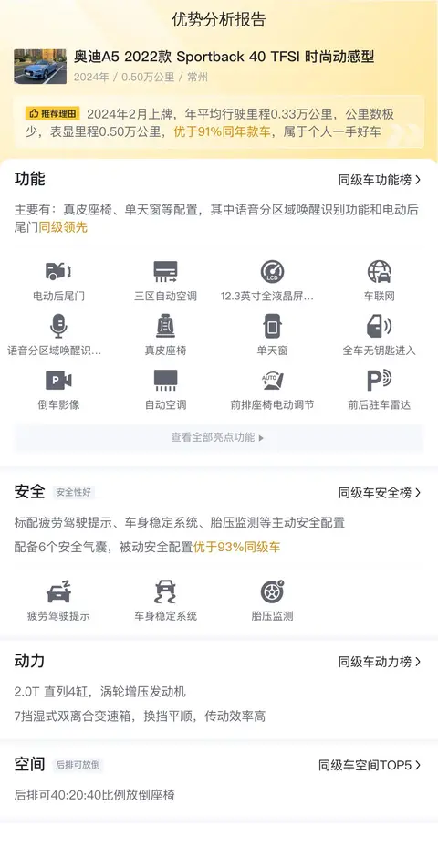 奥迪A5车系在配置部分拥有明显优势。这辆奥迪A5配备有全车无钥匙进入、全景影像、定速巡航、倒车影像、运动座椅等配置,其中语音分区域唤醒识别和电动后尾门两项配置,更是领先同级别竞品车型。在动力部分,这辆奥迪A5搭载的2.0T直列四缸涡轮增压发动机,百公里加速7.7秒,优于68%同级别竞品车型。因奥迪A5车系定位为中型跑车,在意此类车型的消费者往往更注重车辆的操控性和驾驶质感,这辆奥迪A5采用清一色的多连杆式独立悬挂,能够满足绝大部分追求驾驶的消费者的喜好。