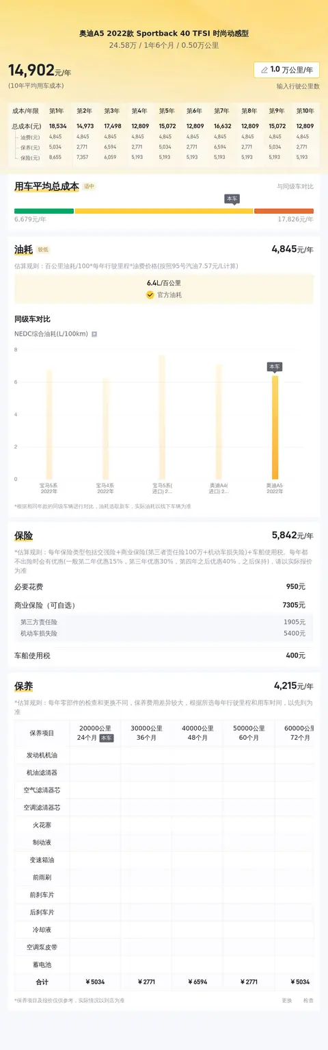 养车成本部分,根据懂车帝平台估算的数据,这辆奥迪A5的年度用车成本约14645元(按每年行驶1万公里计算)。其中,年度商业保险费用约5972元,年度常规保养费用约3108元,年度燃油消耗费用约5565元。养车成本与车主的实际用车场景和使用强度有直接关系,上述数据仅供参考。