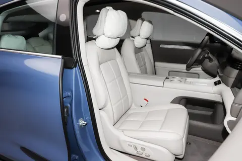 坐进前排,一眼就看到了仪表台上的三块大屏幕。这些屏幕的布局挺特别的。仪表屏和中控屏幕做成双联屏的效果,安置在方向盘前方。而副驾的屏幕则更靠近乘客。有点像中式园林的逻辑,给到了错落有致的效果。他这个安排还是很务实的。司机开车手握方向盘,所以无论中控还是仪表都是常规的布置位置,这个没毛病。副驾配上了更大的屏幕,还和乘客保持了一个比较近的距离。我觉得这个安排很好。这样即使半躺在副驾这张零重力座椅上看剧,也可以看得一清二楚。是不是很爽?副驾这张零重力座椅给人感觉挺不错的。躺上去够软糯,但又不会过让人有过分深陷。前排两张座椅的靠背是可以往后放倒的。这样后排就变成了一张贵妃。无论是躺着放空自己,还是和小孩一起看动画片,感觉还是很惬意的。