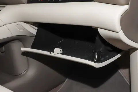 副仪表台的布局和很多电车是一样的。没有安排实体按键,也没有凸起的部分。整体看起来很整洁。包裹饰面的材料比较软糯。整个前排的档次感和时尚感都挺足的。而且呢,两指在屏幕上滑动就能直接调节温度和风量等等,用起来很丝滑。还要什么实体按键呢?