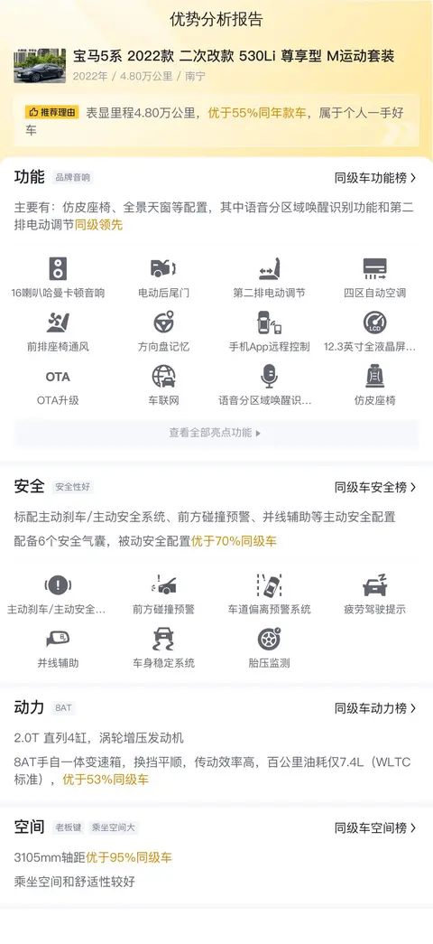 据估算,同级车的最低用车成本是6505元/年,最高是17720元/年,宝马5系 2022款 二次改款 530Li 尊享型 M运动套装是15154元/年,用车成本较高。
