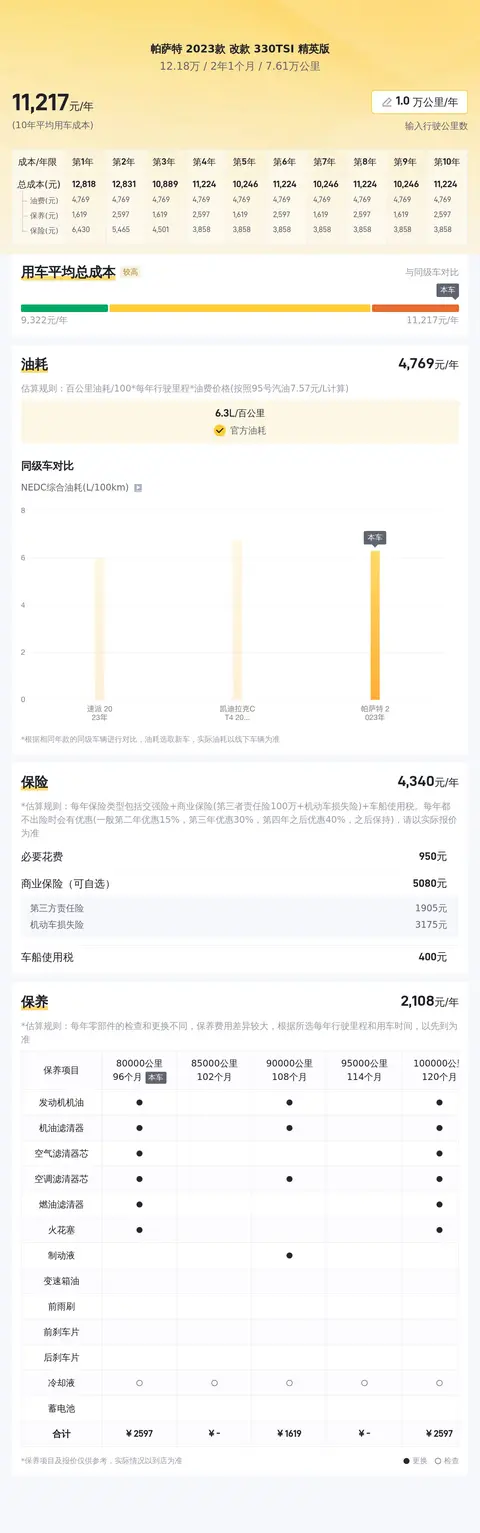 另外,同级车的最低10年平均用车成本是6143元/年,最高是12702元/年,帕萨特 2023款 改款 330TSI 精英版是11217元/年,是适中的水准。
