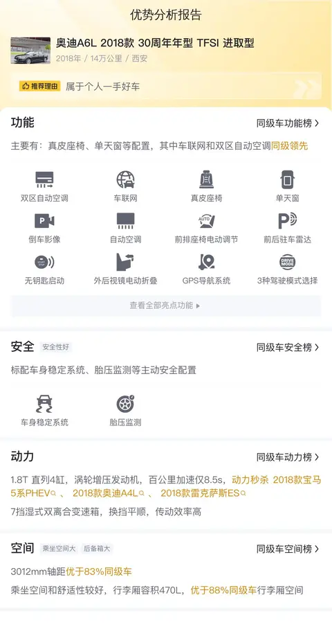 这辆奥迪A6L 2018款 30周年年型 TFSI 进取型搭载一台1.8T涡轮增压发动机,最大功率190马力,峰值扭矩320牛·米,配合7挡双离合变速箱,使得车辆在保证充沛动力的同时,也具备了良好的燃油经济性。官方公布的百公里加速时间为8.5秒,充分展现了其出色的加速性能。而在底盘悬挂方面,奥迪A6L采用了前五连杆独立悬挂和后梯形连杆独立悬挂的组合,既保证了行驶的平稳性,又提升了车辆的操控性能。此外,车辆还配备了诸如ABS防抱死、EBD电子制动力分配、EBA刹车辅助等多项主动安全配置,为驾驶者和乘客提供了全方位的安全保障。