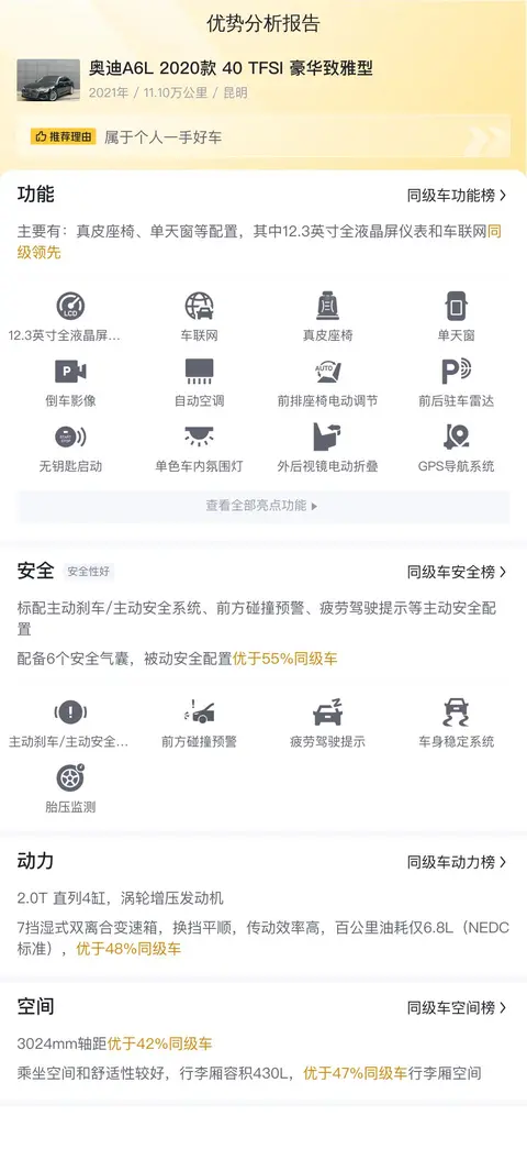 奥迪A6L 2020款 40 TFSI豪华致雅型虽然是2021年的车,但开了4年多也有11.1万公里的里程,也算是正常家用车的水平。不过从积极的一面来看,这辆车的功能配置比较实用,空间宽敞,油耗相对较低,而且报价在市场行情中属于合理的范围,保值率也比较高。不管怎么说,只有面面俱到的车才能成为家庭用车的首选,而这辆车就具备这样的特质,如果你正在为选一辆合适的家庭用车而发愁,不妨考虑一下它!