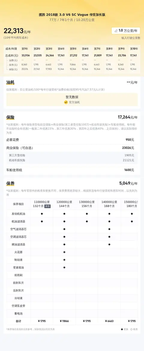 在评估一款二手车的购买价值时,除了考虑购车成本,还应纳入日常使用与保养的成本。基于对这款车的平均用车成本的估算,您可以据此评估自己的经济能力是否适合购买。