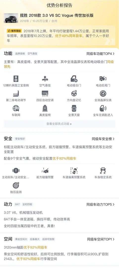 综上所述的新车含税价、用车成本、市场行情、优势分析、同款比价等数据仅供参考。在配置部分,因为二手车非标品,车辆可能会存在配置改装的情况,具体车况信息需要线下结合车辆实际情况进行综合参考。