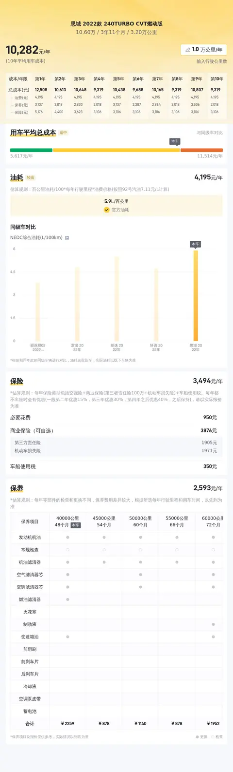 据估算,同级车的最低用车成本是4465元/年,最高是11736元/年,思域 2022款 240TURBO CVT燃动版是10356元/年,所以用车成本相对较高。