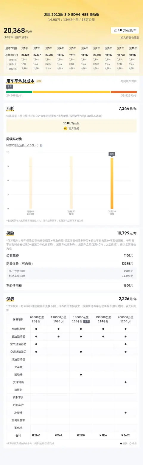 关于用车成本部分,根据懂车帝对发现 2012款 3.0 SDV6 HSE 柴油版的分析,该车的10年平均用车成本约为21786元/年,这个用车成本金额仅供参考,实际用车成本还是要根据车辆的实际使用情况而有所不同。