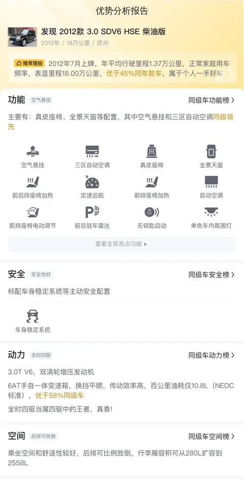发现 2012款 3.0 SDV6 HSE 柴油版配备了真皮座椅、全景天窗等配置,其中空气悬挂和三区自动空调同级领先。动力方面,搭载3.0T V6,双涡轮增压发动机,6AT手自一体变速箱,换挡平顺,传动效率高,百公里油耗仅10.8L(NEDC标准),优于58%同级车,全时四驱当属四驱中的王者,真香!