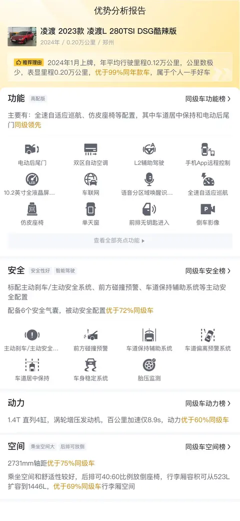 综上所述,这款凌渡在车况、配置、安全、动力性能、驾乘感受与空间、市场行情与用车成本以及竞品对比等方面均表现出色,是一款性价比很高的车型。如果您正在寻找一款性能卓越、配置丰富且价格合理的二手车,那么这辆凌渡将是一个不错的选择。最后,提醒您在购买二手车时一定要选择正规的渠道和商家,确保车辆的质量和售后服务。