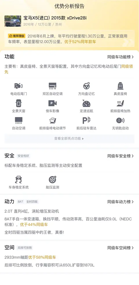 优势:作为一款豪华SUV,宝马X5(进口) 2015款 xDrive28i在动力、操控、舒适性等方面都表现出色。它搭载的2.0T发动机和8AT变速箱提供了强劲而平顺的动力输出,全时四驱系统则确保了车辆在各种路况下的稳定性和通过性。内饰方面,高品质的材料和精致的工艺营造出高端的氛围,主要特点包括高品质皮革座椅、精细缝线、金属饰条以及高级音响系统等,共同打造舒适驾乘体验。这款车型的二手价格目前在13.58万,性价比较高,对于追求驾驶乐趣和豪华体验的消费者来说,无疑是一个不错的选择。