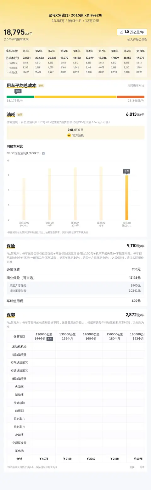 宝马X5(进口) 2015款 xDrive28i每年的用车平均总成本大约是19170元(按每年行驶1万公里计算),这项花销适中,毕竟这么大的车,也是可以理解的。