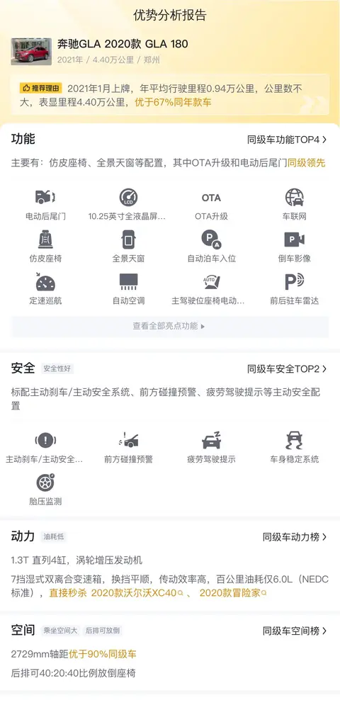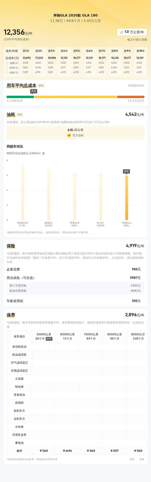 据估算,奔驰GLA 2020款 GLA 180的用车成本是12468元/年,同级车最低是11468元/年,最高是16878元/年,所以用车成本偏低。