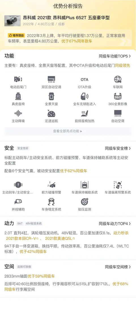 劣势方面,4次过户,可能会影响到客户的判断,需要结合实车情况进一步确认。同时昂科威 2021款 昂科威Plus 652T 五座豪华型属于美系车,油耗可能比较高。