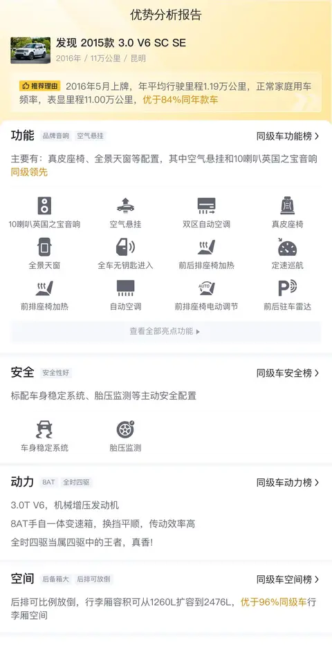 这辆2015款路虎发现3.0 V6 SC SE,表显里程11万公里,配备全景天窗、空气悬挂及10喇叭英国之宝音响。新车指导价82.8万,现二手报价27.6万,较新车便宜55.2万。2016年5月首登昆明,1次过户记录,符合欧V排放标准。