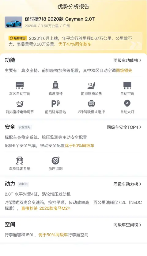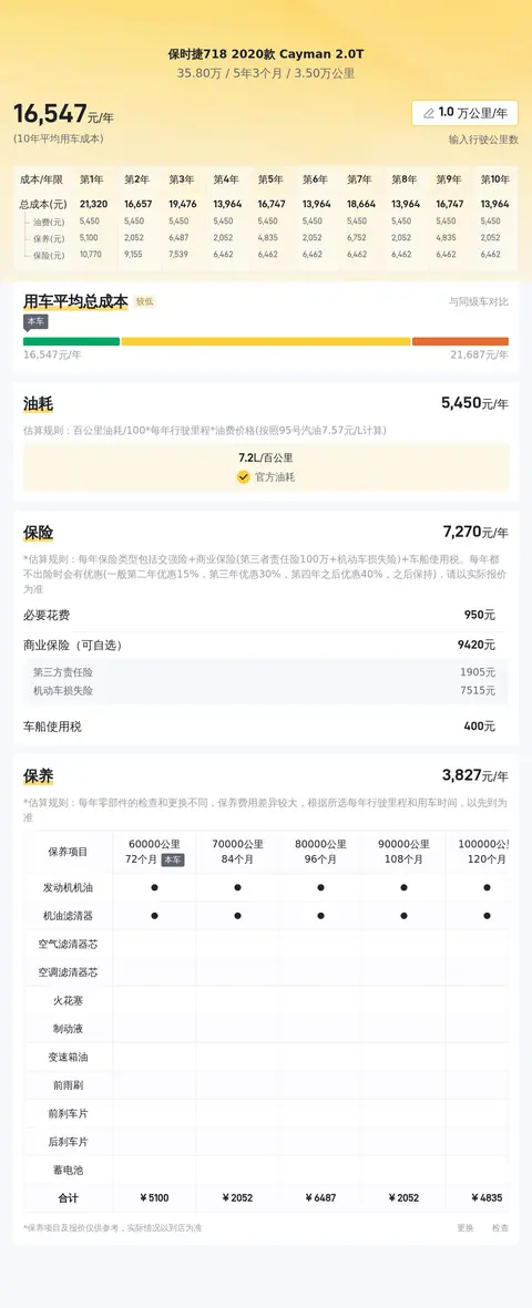 另外,根据估算,这辆保时捷718 2020款 Cayman 2.0T的10年平均用车成本是17180元/年,而同级车的最低10年平均用车成本是15865元/年,最高是40707元/年,所以这辆车的用车成本适中。