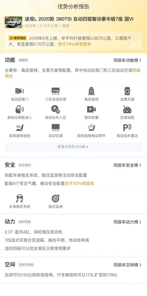 综上所述,这辆途观L 2020款 380TSI 自动四驱智动豪华版7座 国VI在动力、空间、配置等方面表现出色,适合追求强劲动力、宽敞空间和丰富配置的消费者。然而,其油耗、变速箱维护、内饰材质和噪音问题也是潜在车主需要考虑的因素。总体而言,如果您注重动力性能和空间舒适性,并能接受较高的用车成本和定期维护,这辆途观L将是一个不错的选择。
