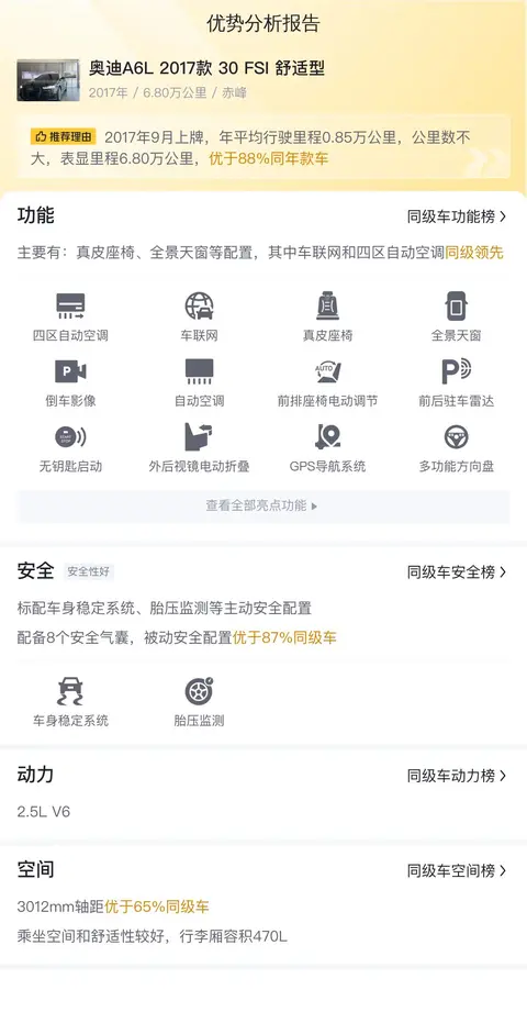奥迪A6L 2017款 30 FSI 舒适型这台车的车身尺寸长5036mm、宽1874mm、高1466mm,轴距3012mm,这样的车身尺寸下有着宽敞的车内空间和舒适的乘坐体验。全家出行轻松自如。搭载2.5L自然吸气发动机,最大功率150kW,最大扭矩250N·m,CVT无级变速(模拟8挡),动力平顺且充足,可以满足日常的通勤需求。官方百公里加速时间为8.8秒,可以满足偶尔对于刺激的追求。NEDC综合油耗7.6L/100km,经济实惠,日常用车成本较低。