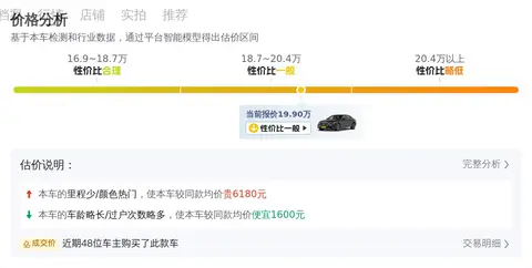 当前市场上,这款车型的二手车价格区间大致在19.22万元至23.01万元之间。然而,请注意,具体的交易价格会受到多种因素的影响,包括车辆的年限、行驶里程、保养状况等。车况的不同将直接影响到最终的成交价格。关于这辆车的售价,卖家给出的价格为19.9万元。在评估车辆价值时,考虑到了以下几个关键因素:首先是车辆的里程,该车里程为7.8万公里,少于均值1.5万公里,这一因素使得车辆估价增加了4500元。其次是车龄,该车车龄为8年,多于均值0.1年,这一因素使得车辆估价减少了600元。再次是过户次数,该车过户次数为1次,多于均值0.3次,这一因素使得车辆估价减少了1000元。最后是车辆的颜色,该车颜色为黑色,这一因素使得车辆估价增加了1680元。除了这些具体因素外,还有其他一些因素也可能影响到车辆的价值。包括车辆的外观、内饰状况、保养记录、市场需求等等。因此,在评估一辆二手车的价值时,需要综合考虑多个方面的因素,并结合具体的车况来进行评估。