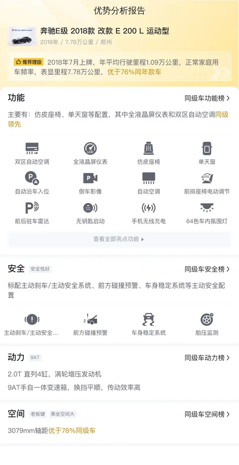 如图片所示,这辆奔驰E级 2018款 改款 E 200 L 运动型,属于中大型轿车类别,首次上牌时间为2018年7月,有过一次过户记录,牌照及车辆所在地均在郑州,黑色车身浅色内饰,累计行驶里程为7.7万公里,该车符合国V排放标准。新车指导价为43.58万元,而现在的二手车报价仅为19.9万元,相较于新车价格便宜了23.68万元,首付款项5.91万元即可将其带回家。