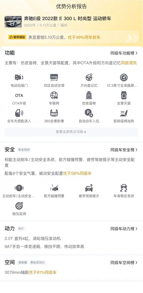 综上所述,这款奔驰E级 2022款 E 300 L 时尚型 运动轿车是一款集豪华、科技、性能于一身的中大型车。它不仅拥有出色的外观设计和豪华的内饰配置,还具备强劲的动力输出和优异的操控性能。无论是日常通勤还是长途旅行,它都能为驾乘者带来舒适且高品质的驾乘体验。当然,在购买二手车时,我们也需要特别注意车辆的状况、行驶里程、过户次数等因素。建议消费者在购买前能够对车辆进行详细的检查和了解,确保所购买的车辆品质可靠、价格合理。只有这样,才能真正享受到购买二手车所带来的实惠和便利。最后,如果您正在寻找一款高品质的中大型车,那么这款奔驰E级无疑是一个值得考虑的选择。它将为您带来独一无二的驾乘体验,并让您的出行更加轻松、愉快!