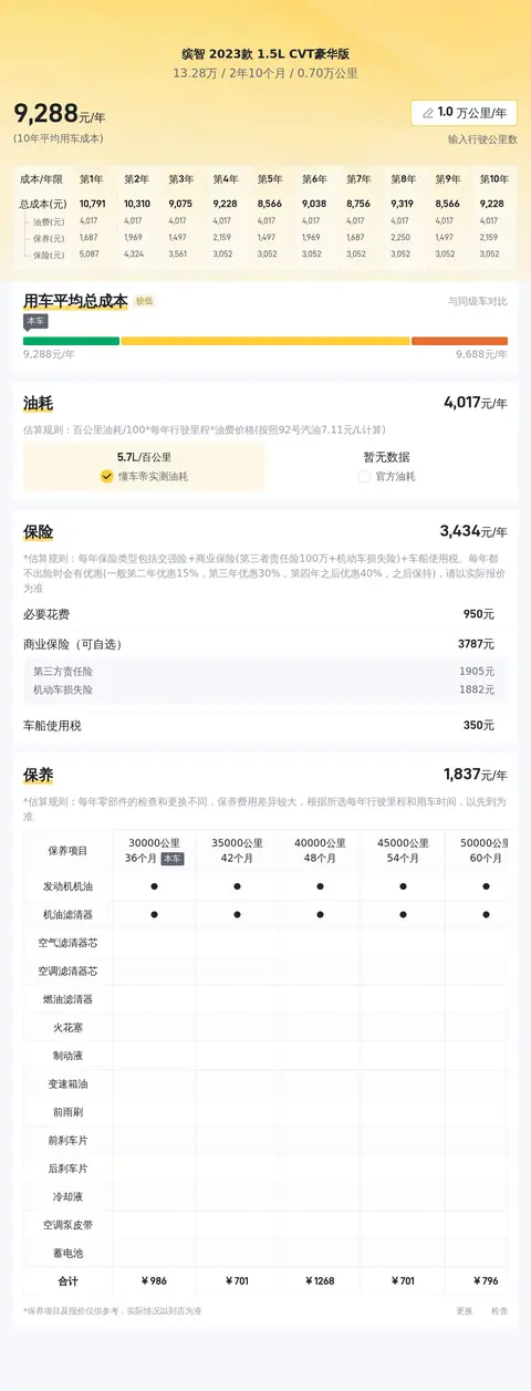 养车成本方面,按一年行驶一万公里计算,该型车每年燃油、保险及保养的综合用车成本约6633元,具体费用要看用车频率及使用环境而定。