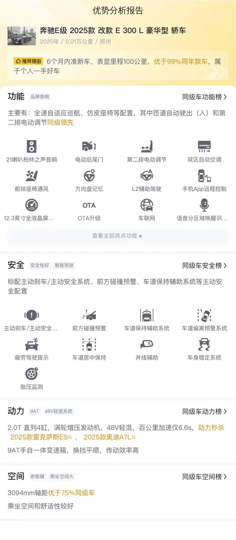 该车与2025年9月在郑州上牌,至今行驶了100公里,车源地与车牌地位于同一地区,过户次数为0次,车身颜色为黑色,型号为奔驰E级 2025款 改款 E 300 L 豪华型 轿车,属于中大型车类别。该车的新车指导价为52.98万元,而当前的二手车报价为46.98万元。