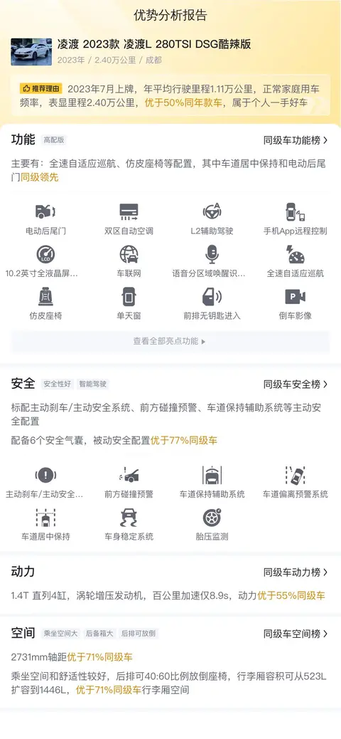 凌渡 2023款 凌渡L 280TSI DSG酷辣版的新车含税价是18.74万,目前的二手车报价是10.58万,约开了2年,有8.11万的差价。从目前的市场行情来看,这款车的热度较高,价格也比较实惠,是一款值得考虑的车型。凌渡2023款凌渡L280TSI DSG酷辣版的行驶里程较少,保养记录齐全,车况良好。同时,该车还配备了多项智能科技配置,如全速自适应巡航、车道居中保持辅助系统、自动泊车入位等,让驾驶更加轻松便捷。座椅采用仿皮材质,包裹性和舒适性都非常出色,让乘客在行驶过程中能够享受到更加舒适的乘坐体验。总的来说凌渡2023款凌渡L280TSI DSG酷辣版是一款集时尚、豪华、智能于一体的轿车,无论是外观还是内饰都表现出色,为驾驶者和乘客带来了更加愉悦的驾乘体验。