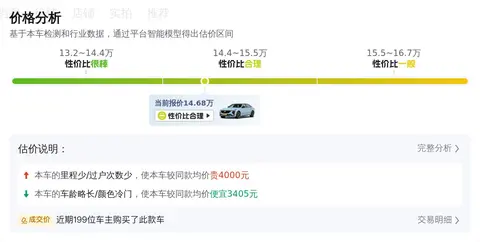 车况方面,该车支持分期购车,说明银行已对该车车况进行过评估,同意以低于新车价格的金额为其提供贷款。用车成本方面,该车的年均综合用车成本约为13,333元/年,另外,考虑到车辆折旧,预计再行驶2年后可卖11.67万,约折价13.6%。市场行情方面,目前该车的市场行情大致在14.62万至17.54万之间,依据车况不同,价格也会有明显区别。在全国范围内与本车相似的仍有很多车源,方便您比较和选购。