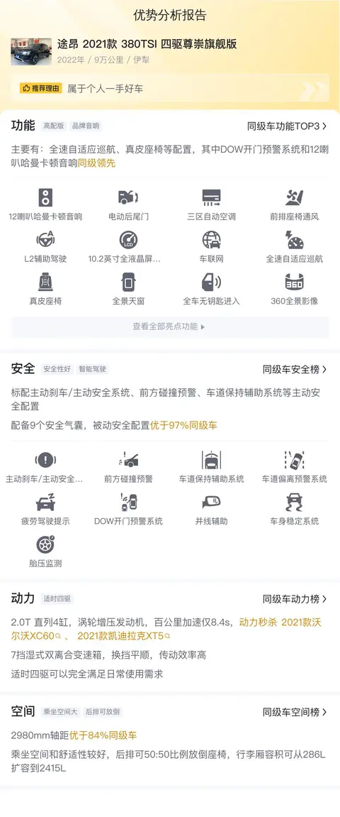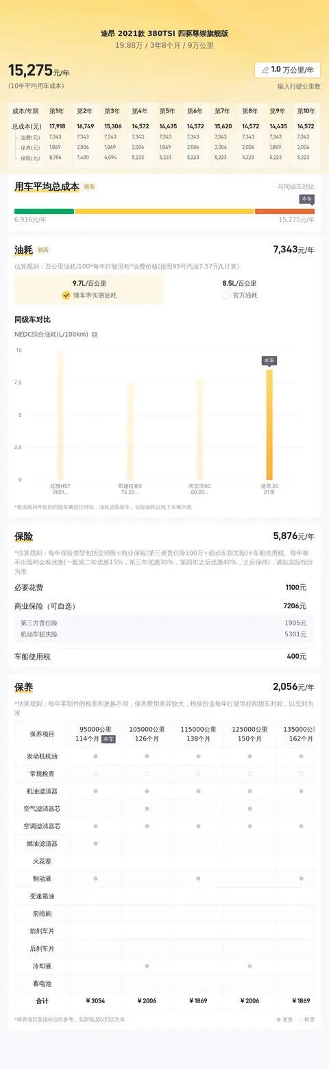 另外,根据估算,同级车的最低用车成本是8609元/年,最高是17776元/年,而途昂 2021款 380TSI 四驱尊崇旗舰版是15187元/年,用车成本适中,不占什么优势。