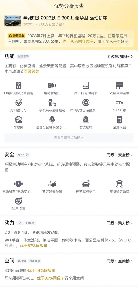 我们先来简单了解一下这辆二手奔驰E级的基本情况,它具体是——2023款 E 300 L 豪华型 运动轿车。该车采用了黑色外观,上牌地为泉州,目前行驶里程为2.8万公里。该车于2023年7月首次上牌,至今无过户记录。新车指导价为50.41万元,而现在的二手车报价为35.5万元。