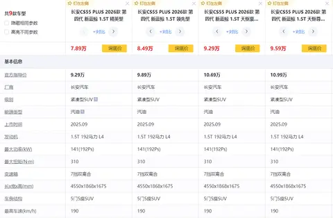 第四代长安CS55 PLUS(逛导购)全系共推出四款配置车型,指导价处于9.29万至10.99万区间,若叠加无门槛置换补贴与限时国庆出游红包,实际入手价格可低至7.89万起。对比第三代同配置车型,其价格基本保持一致,但配置水平却有明显提升,尤其是在智能辅助驾驶与舒适性配置方面的升级,在10万级燃油SUV领域形成了差异化优势。这款车型的核心特点可概括为“四悦”,即关乎动力与辅助驾驶的“悦动驾驭”、围绕空间与配置的“悦享舒适”、聚焦安全防护的“悦行安全”,以及体现在设计层面的“悦目设计”,接下来将结合实际试驾体验展开详细说明。