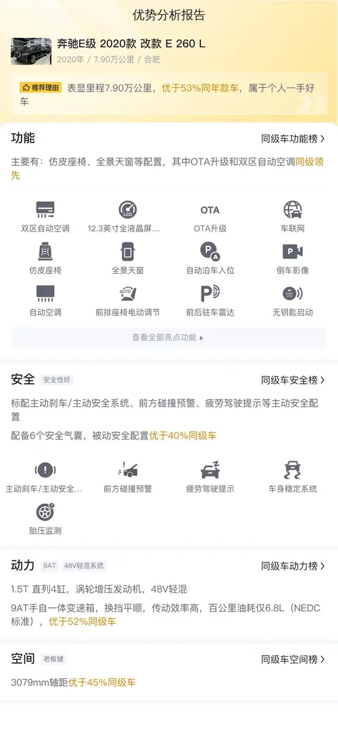 这辆奔驰E级 2020款 改款 E 260 L,位于安徽合肥,2020年9月上牌,黑色车身,行驶里程7.9万公里,京V排放标准,没有过户记录,新车指导价42.98万,目前二手车报价20.68万。