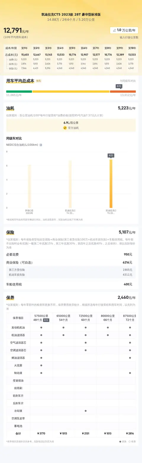 当然,除了车辆本身性能和车况外,购车还涉及经济方面的考量。这款凯迪拉克CT5的百公里油耗为6.9升(基于NEDC标准),考虑到其强劲的动力,这一油耗水平相当合理。在维护保养方面,凯迪拉克品牌因其较高的技术和品质要求,建议在专业的授权经销商处进行定期保养,以确保车辆的长期性能和安全性。虽然这一过程可能会相比一些普通品牌稍显昂贵,但对于保护您的爱车和投资而言,无疑是值得的。今天这台凯迪拉克CT5的售价为14.88万元,首付4万多就能开回家,可以说价格还是非常香的,喜欢的朋友可以先安排上车后再吃烤肠哦!
