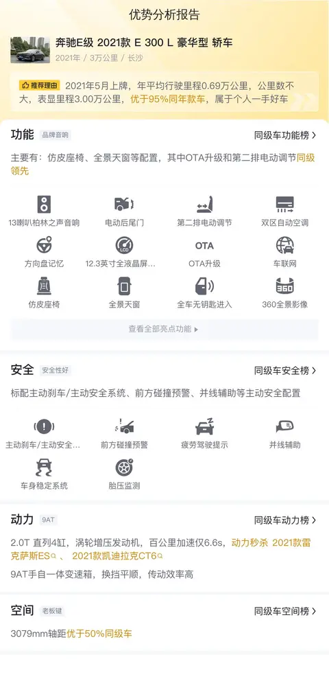 配置方面,该车配备有仿皮座椅、全景天窗等,以及OTA升级和第二排电动调节等领先同级的功能,还拥有12.3寸全液晶仪表盘、方向盘记忆、前排座椅记忆等配置。安全性方面,标配主动刹车/主动安全系统、前方碰撞预警、并线辅助、疲劳驾驶提示等主动安全配置,配备7个安全气囊,被动安全配置优于90%同级车。少于均值3.9万公里,加21300元;多于均值0.1年,少扣1200元;少于均值0.3次,加1800元;颜色,黑色,加204元。综上所述,本车完全符合优质优价的标准,当前车况下,31.68万的售价,在同级别竞品车型中占有很高的性价比,而且奔驰的品牌形象和豪华感,会为车主带来完全不一样的体验,非常值得推荐。