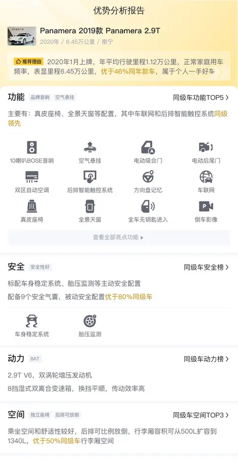对于大部分男人而言,保时捷不仅仅是一个汽车品牌,更是一种身份的象征,而保时捷帕拉梅拉更是将这种象征意义具象化,流畅优雅的猎装车身,性感的腰线,以及轰鸣的发动机无时无刻不在挑逗着每一个不甘平凡的眼球,但... 新车动辄百万起步的价格属实让人望而却步,所以,今天这辆二手保时捷Panamera(图片|配置|询价) 2019款 Panamera 2.9T,新车含税价106.17万,现在二手报价59.8万,便显得格外的吸引人,接下来,就让我们一起看看这辆车的具体情况吧~