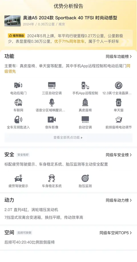 在二手车市场中,奥迪A5 2024款 Sportback 40 TFSI 时尚动感型凭借其出色的性能、优雅的设计和合理的价格,成为许多消费者的理想选择。它的市场表现稳定,保值率较高,适合那些追求品质和性价比的消费者。如果您正在寻找一款既能满足日常出行需求又能带来驾驶乐趣的二手车,那么奥迪A5 2024款 Sportback 40 TFSI 时尚动感型绝对是一个值得考虑的选择。但请注意,二手车的情况因车而异,建议在购买前进行详细的检查和评估。