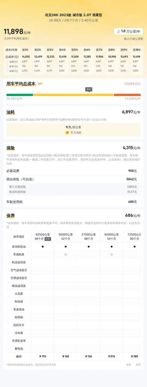 据估算,同级车的最低用车成本是5685元/年,最高是12836元/年,坦克300 2023款 城市版 2.0T 我看型是12180元/年,所以用车成本较高。