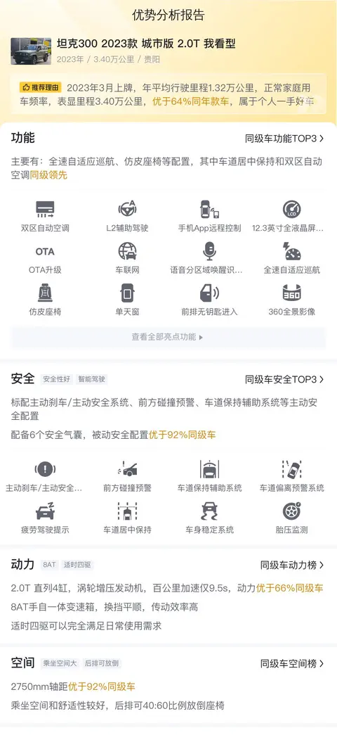 报价相对较低,坦克300 2023款 城市版 2.0T 我看型的市场行情价是15.01万-17.95万,它的报价是16.88万,价格上有优势,同时保值率也高。