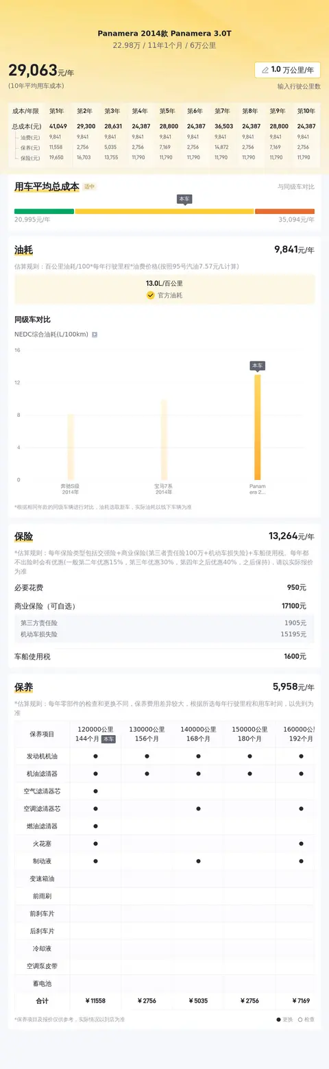 据估算,Panamera 2014款 Panamera 3.0T的用车成本是28604元/年,同级车最低是28604元/年,最高是47724元/年,所以它的用车成本较低。
