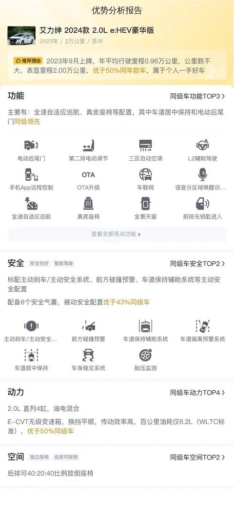 综上所述的新车含税价、用车成本、市场行情、优势分析、同款比价等数据仅供参考。在配置部分,因为二手车非标品,车辆可能会存在配置改装的情况,具体车况信息需要线下结合车辆实际情况进行综合参考。