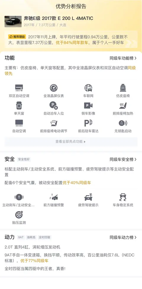 这辆二手奔驰E级的具体版本是——奔驰E级 2017款 E 200 L 4MATIC,它的上牌地为辽宁大连,上牌日期2017年11月,表显里程7.37万公里,新车指导价45.98万,二手车报价16.5万,过户次数0次。车身尺寸方面,该车的长宽高分别为5065mm、1860mm、1482mm,轴距3079mm,这样的车身尺寸不仅保证了车内空间的宽敞舒适,更彰显出车辆自身的霸气。