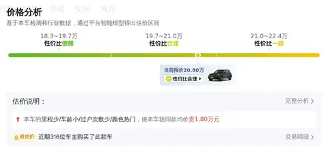 目前,这款车的二手车市场行情较为乐观。根据懂车帝的大数据分析,这款车在全国同价位二手车市场中销量排行第一,且未来三年内折价较少,说明其保值能力较强。作为消费者,在购买时可以更加放心。需要注意的是,具体的售价还需要根据车辆的实际情况和市场行情来确定。目前这辆车的售价为20.8万元,是一个相对合理的价格。