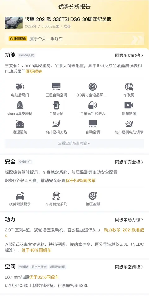 综合懂车帝对这款车的分析,这款迈腾 2021款 330TSI DSG 30周年纪念版在动力性能、安全配置、舒适性和智能互联等方面均表现出色,是一款值得推荐的B级轿车。如果您注重动力性能和驾驶体验,同时又希望车辆能够为您提供全面的安全保护和舒适的乘坐环境,那么这款迈腾是一个不错的选择。
