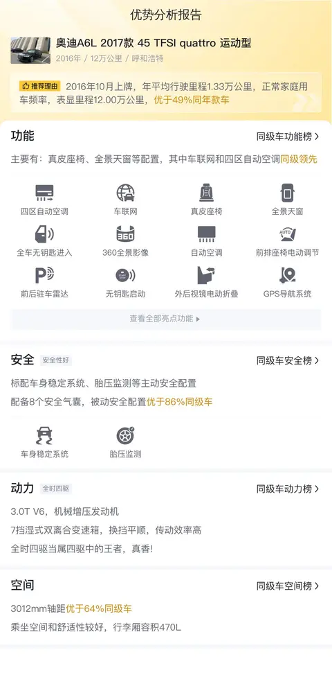 这辆二手奥迪A6L 2017款 45 TFSI quattro 运动型的车源地和上牌地都是呼和浩特,上牌日期2016年10月,表显里程12万公里,新车指导价53.05万,二手车报价14.8万,车身颜色黑色,过户次数1次。可以看得出来这辆车的使用年限较长,行驶里程也较多,但是报价并不算太低,这主要是因为这辆车的车况保持的还不错,并且奥迪A6L的保值率在二手车市场中一直表现良好。