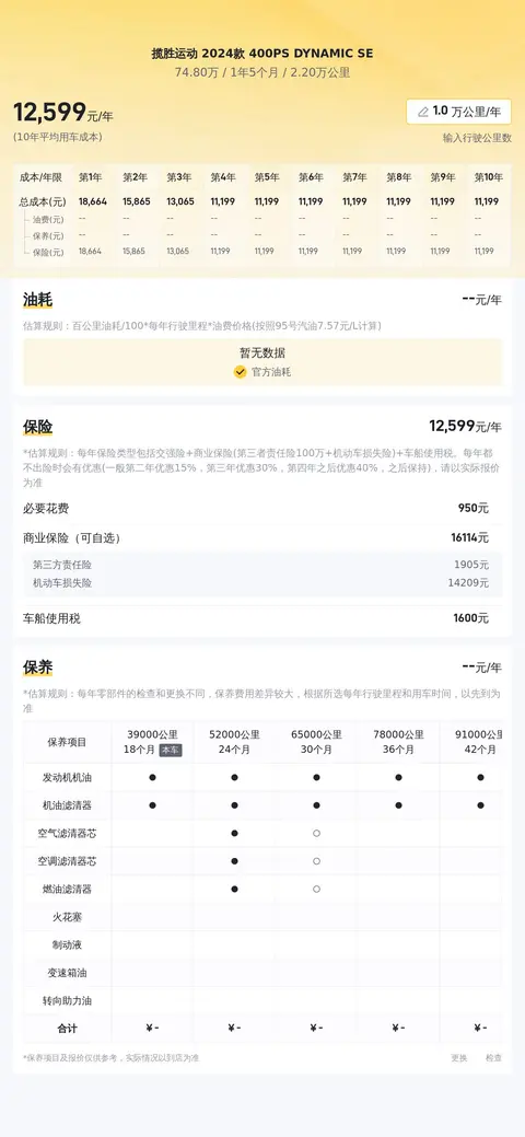 综上所述的新车含税价、用车成本、市场行情、优势分析、同款比价等数据仅供参考。在配置部分,因为二手车非标品,车辆可能会存在配置改装的情况,具体车况信息需要线下结合车辆实际情况进行综合参考。