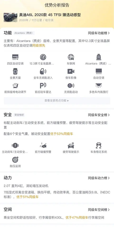 该车是2020年3月上牌的黑色奥迪A6L 2020款 45 TFSI 臻选动感型,个人一手车,车源地及车牌地均为哈尔滨,符合国六排放标准。至今累计行驶里程为11万公里,年平均行驶里程2.63万公里,优于76%同年款车。尤值一提的是,该车虽为二手车但车况良好,且无任何过户及维修记录,属于珍稀的“零维修”车型,更显得难能可贵。