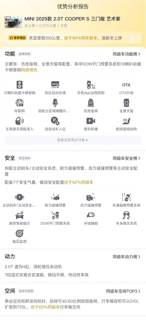 优点:车子比较新,基本是准新车,动力强劲,配置丰富,尤其是安全配置,比较全面。而且别看MINI小,但是内部的空间利用率比较高,能满足家用。另外,MINI的保值率也不错,即便后续想换车,也还能卖一个好价钱。