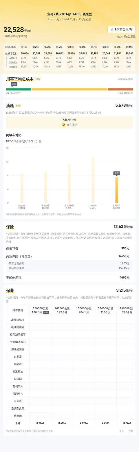 从市场行情角度来看,这辆宝马七系2016款740Li领先的卖价为18.8万元,在同车型中价格处于较低的水平。再从用车成本方面来看,该车官方公布的百公里油耗为7.5升,按照一年行驶2万公里计算,每年的油费约为1.2万元。保险费用方面,预估每年约2万元(包含交强险、商业险和车船使用税)。保养费用方面,预计每年约1.2万元。其他费用方面,停车费、洗车费、过路费、高速公路费等暂且按照每年0.5万元计算。综上所述,按照每年行驶2万公里计算,该车一年的用车成本大约在6.5万元左右。当然,这个费用还是要根据车主的实际使用情况而有所不同。